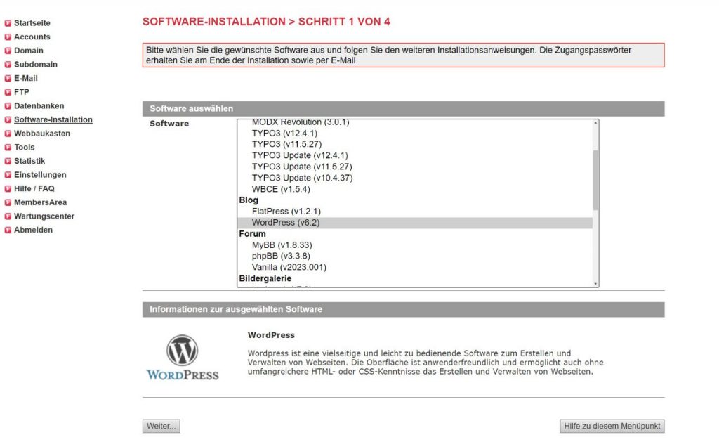 - 1-Klick-Hoster-Installation: Viele Webhosting-Anbieter bieten eine einfache Methode zur Installation von WordPress über ein sogenanntes „1-Klick-Installationsprogramm“ oder ähnliche Tools an. Mit dieser Methode kannst du WordPress schnell und einfach auf deinem Webhost installieren, ohne dass du technische Kenntnisse oder Programmierkenntnisse benötigst. Du musst lediglich grundlegende Informationen angeben, wie z.B. den Installationsordner und die Website-Domain, und der Hoster erledigt den Rest. Meist sind es nicht viele Klicks, wobei 1-Klick etwas übertrieben (untertrieben) ist. Zudem unterscheiden sich die Routinen der Anbieter teils deutlich voneinander und der Name der one-click-Installation kann unterschiedlich sein.
